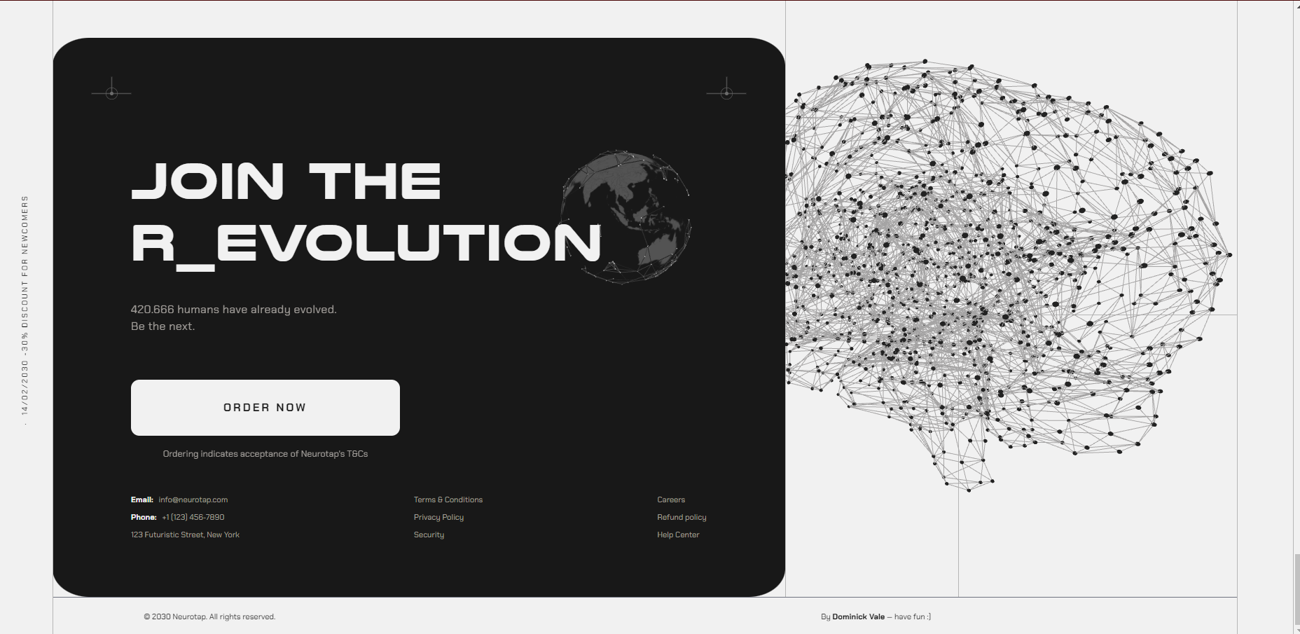 Since i wanted to learn ThreeJS, i also added a 3d Brain model that continuously looks at the cursor, to give that extra sense of surveillance going on, along with a small 3d globe. The Brain is just a 3d model from which i sample verteces positions and use them as positions for small round particles. There’s an invisible plane upon which a raycaster is used to get the mouse position to look at from the brain.
