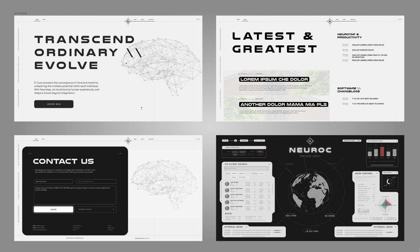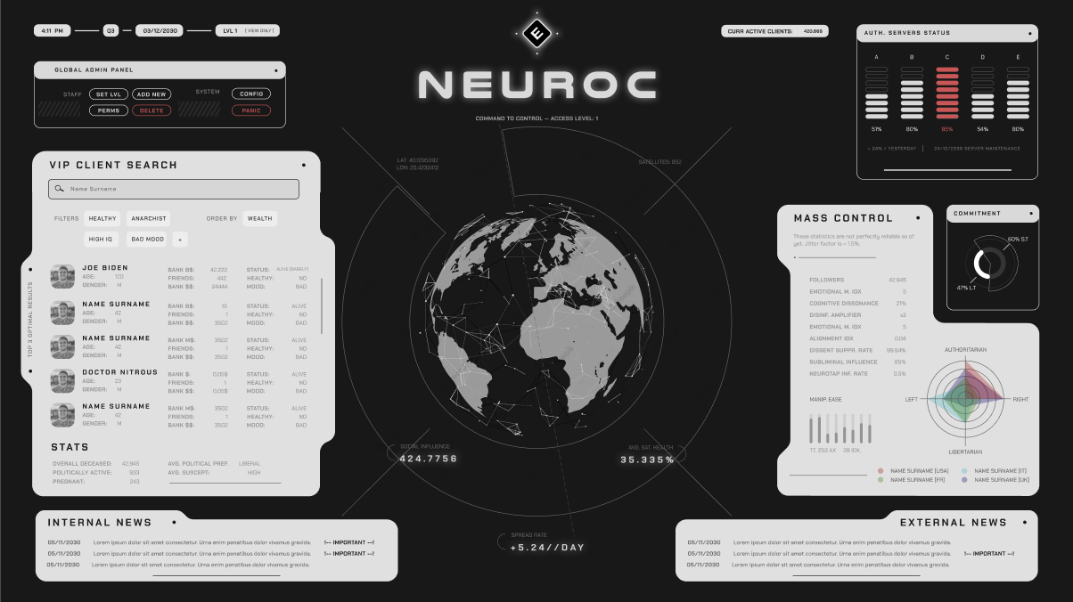 The company name would be E-CORP, (which i totally did not steal from Mr. Robot’s trama, i don’t know what you’re talking about.). And would be just what i would think a company with that amount of power would come to be. As always, i’m a sucker for FUIs, so i went with that style.